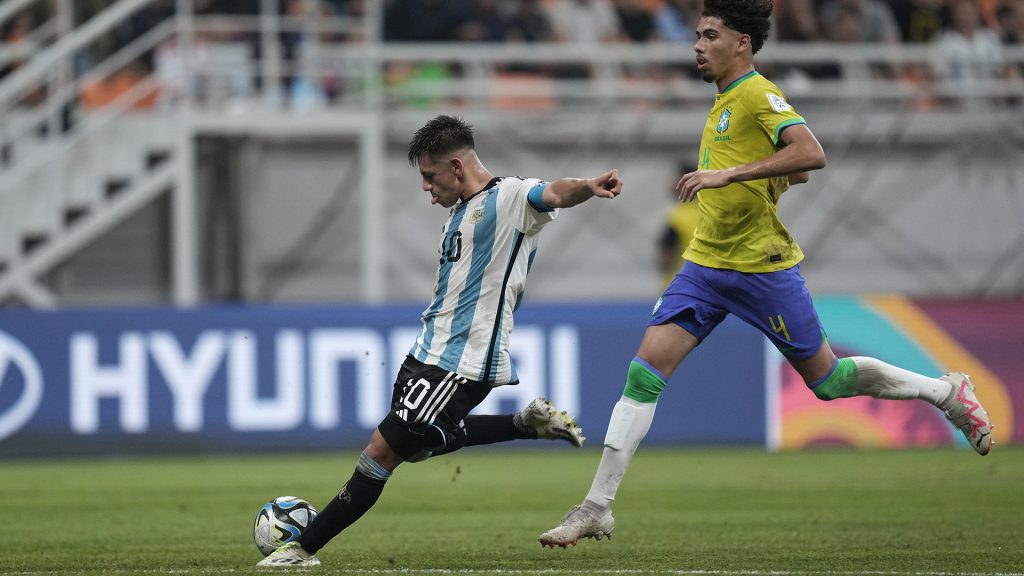 Con tres tantos de Echeverri, Argentina venció a Brasil y clasificó a semifinales