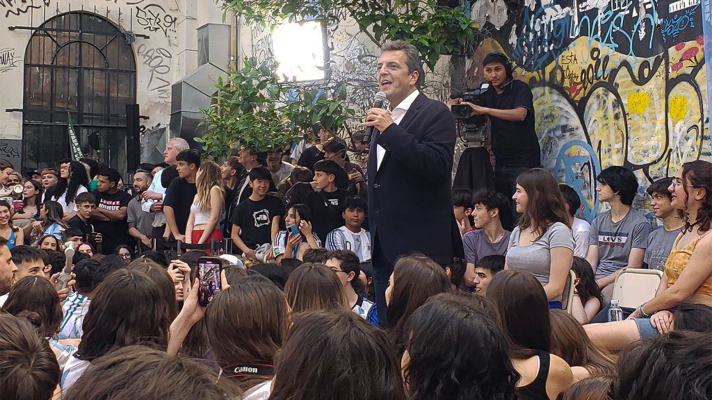 El candidato de Unión por la Patria cerró su campaña para el balotaje del domingo junto a estudiantes de la Escuela Superior de Comercio “Carlos Pellegrini” de CABA, quienes lo ovacionaron y vivaron por su postulación.
