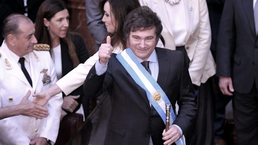 El juramento fue tomado por Cristina Fernández de Kirchner y Alberto Fernández fue el encargado de entregarle la banda y el bastón presidencial. “Viva la Libertad, carajo”, fue la arenga que escribió al firmar el libro de honor del Congreso de la Nación.