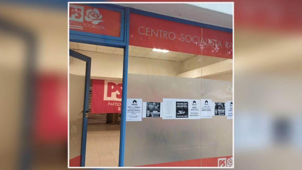 Repudian la vandalización de un local socialista con carteles de Milei